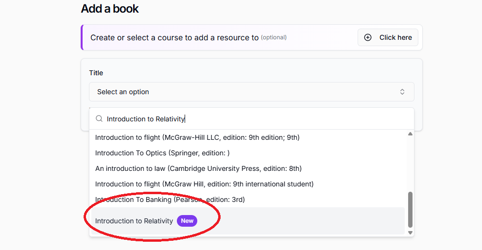 You also have the option to add the resource to a course you’ve made in Sylla – just select “Click here” at the top of the Add a book page.