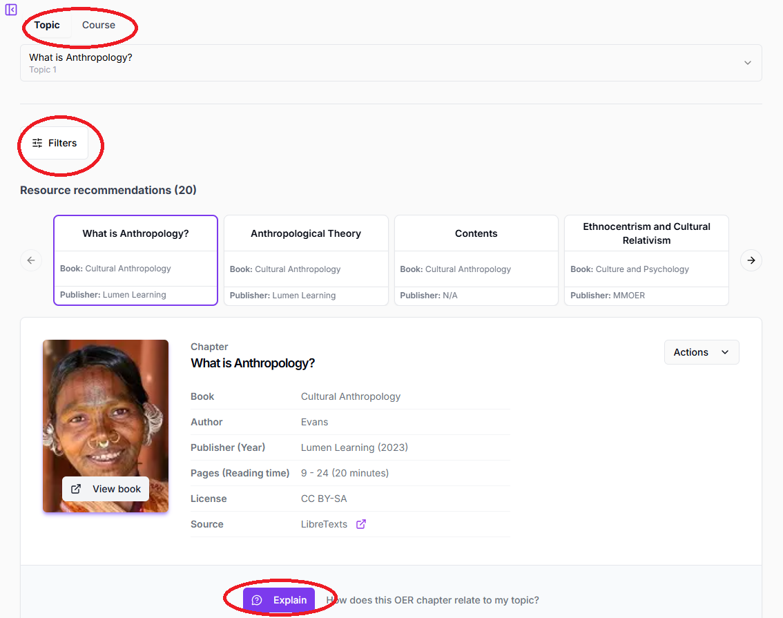 Sylla defaults to looking for OER for specific chapters (for books) or topics (for courses). You can choose which topic or chapter you want to focus on by choosing the drop-down menu at the top of the page. Alternatively, you can select “Book” or “Course” to view recommended options for the entire resource or course.